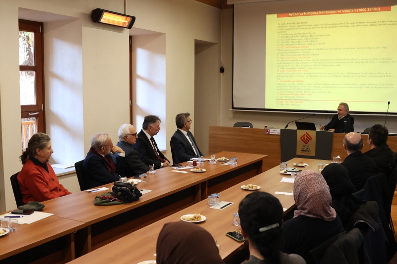 Fatih Sultan Mehmet Vakıf Üniversitesi Vakıf Kültürü ve Medeniyeti Uygulama ve Araştırma Merkezi tarafından düzenlenen Ayasofya Vakıf Konferansları kapsamında Doç. Dr. Eyüp Sabri Kala, “Vakıf Medeniyeti Çerçevesinde Fatih Sultan Mehmet Han’ın İstanbul’u” başlıklı bir konferans verdi.