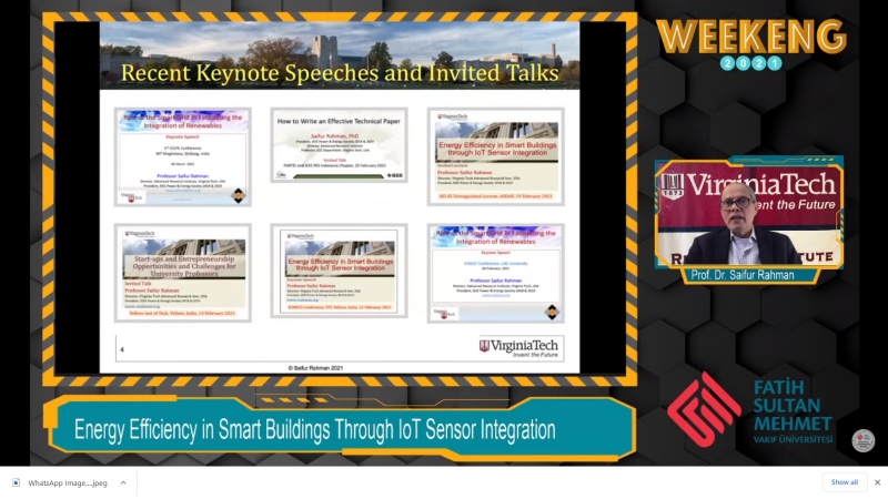 Zirvenin ilk gününde Rektör Yardımcımız Prof. Dr. Z. Hakan Akpolat ve Mühendislik Fakültesi Dekanı Prof. Dr. Ali Yılmaz Çamurcu’nun açılış konuşmalarının ardından ilk oturumda Bilgi Ekonomisi Derneği Başkanı Prof. Dr. Davut Kavranoğlu “Bilim, Teknoloji ve Eğitimin Ülkelerin Kalkınması İçin Kritik ve Belirleyici Rolü” başlıklı sunumunu gerçekleştirdi. İkinci oturumda ise yaşam boyu IEEE dostu seçilen Prof. Dr. Saifur Rahman (Virginia Tech Advanced Research Institute Arlington, Virginia, USA) “Energy Efficiency in Smart Buildings Through IoT Sensor Integration” başlığında bir konuşma yaptı.